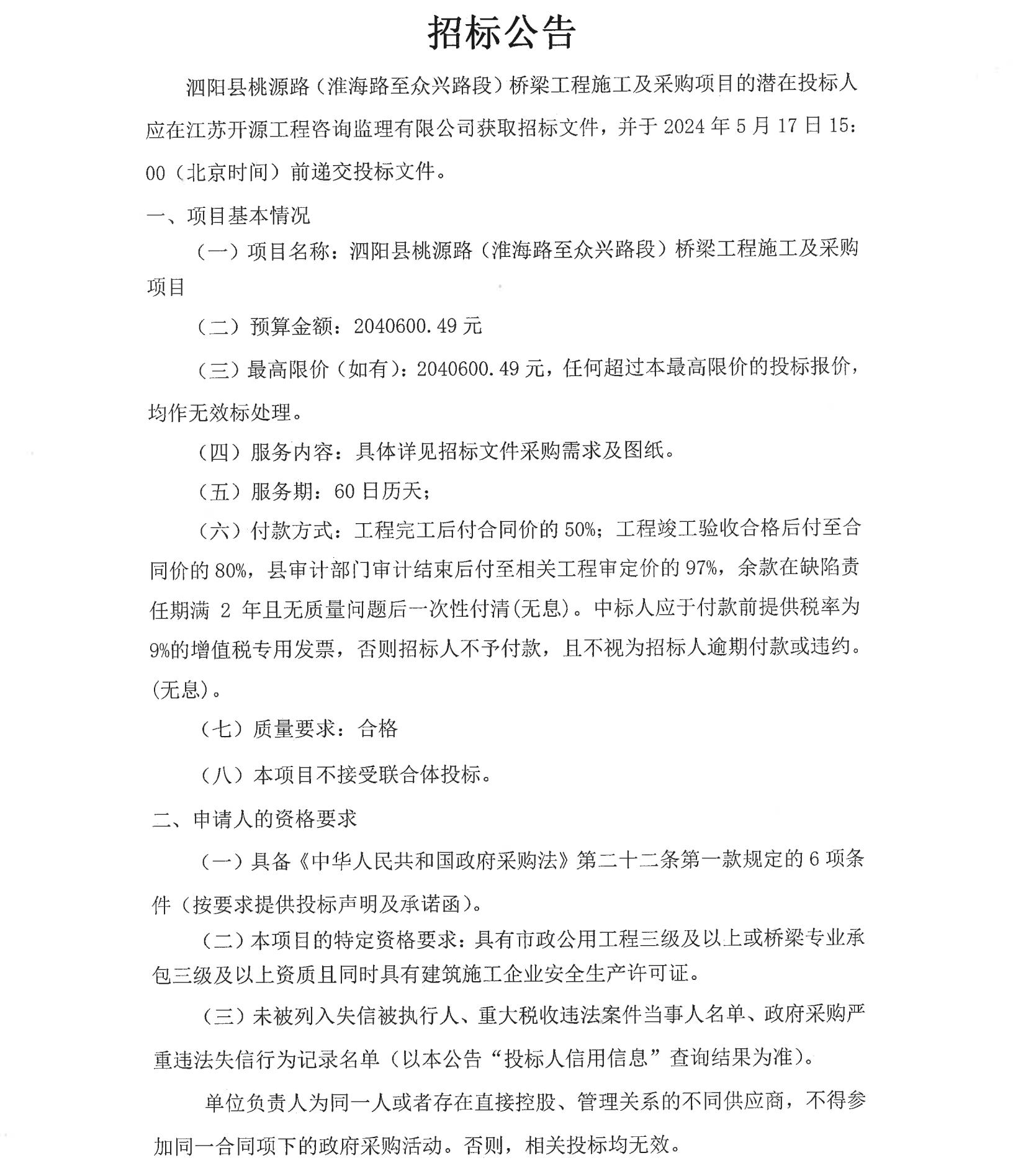 泗陽縣桃源路(淮海路至眾興路段)橋梁工程施工及采購 項(xiàng)目招標(biāo)公告