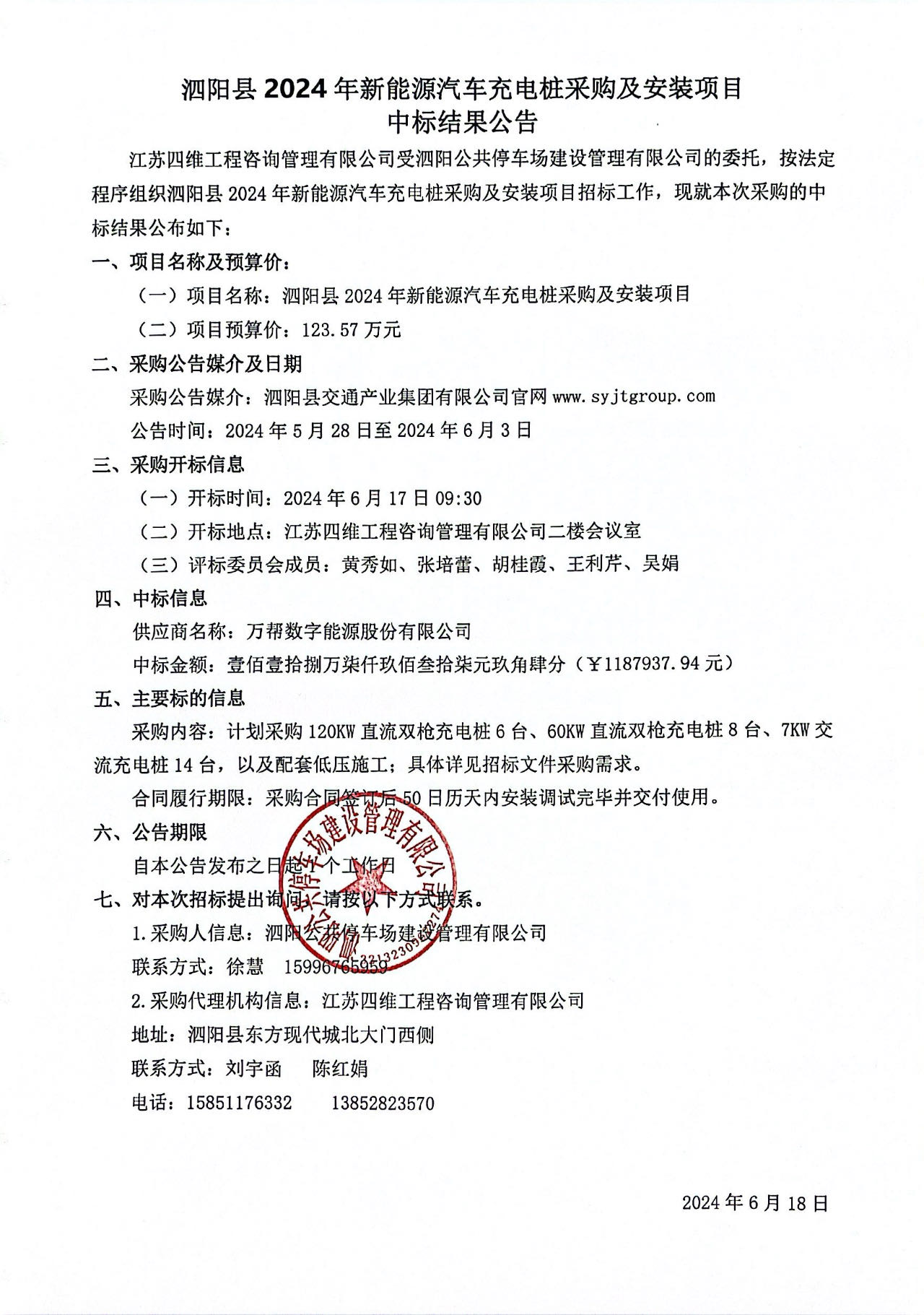 泗陽縣2024年新能源汽車充電樁采購及安裝項目中標結果公告
