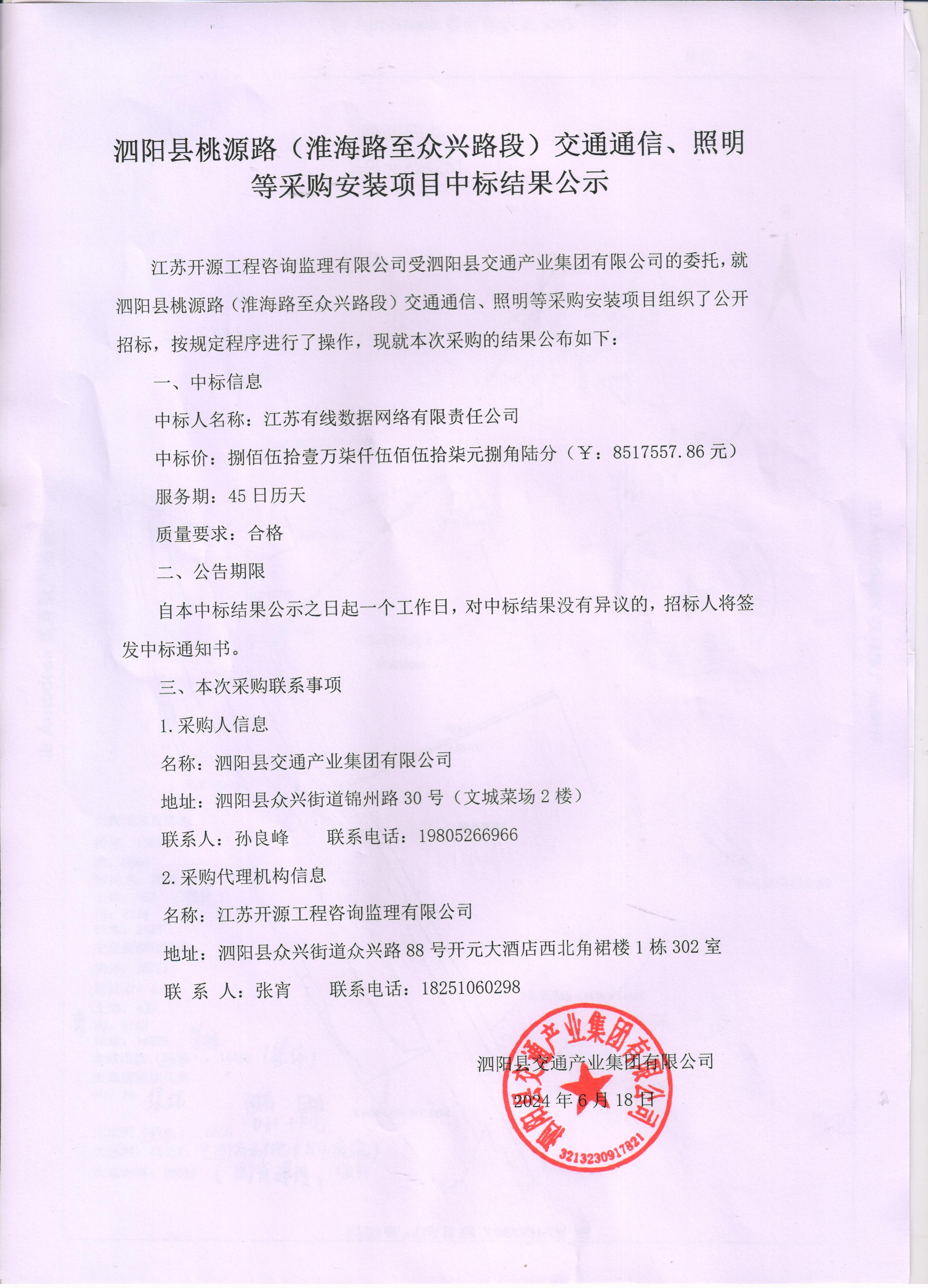 泗陽縣桃源路(淮海路至眾興路段)交通通信、照明等采購安裝項目中標結(jié)果公示