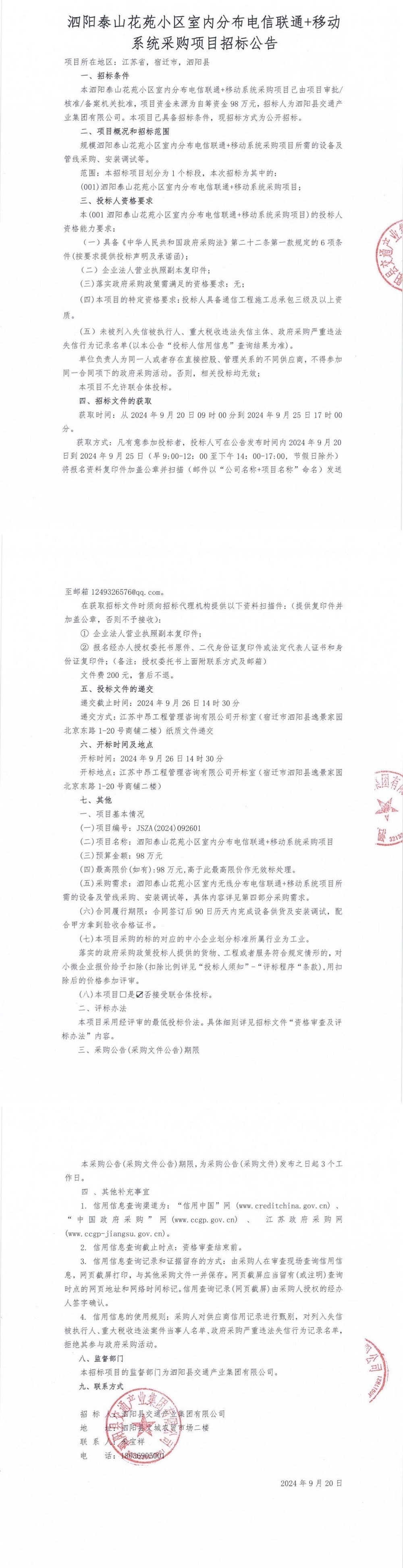泗陽泰山花苑小區(qū)室內(nèi)分布電信聯(lián)通+移動系統(tǒng)采購項目招標(biāo)公告